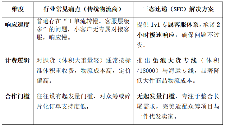 针对行业内普遍存在的“中小客户缺乏专属服务、售后响应链条长”这一痛点,许多处于成长期的精细化运营卖家亟需更灵活的服务支持。三态速递(SFC)通过差异化的服务体系,有效填补了这一市场空白。