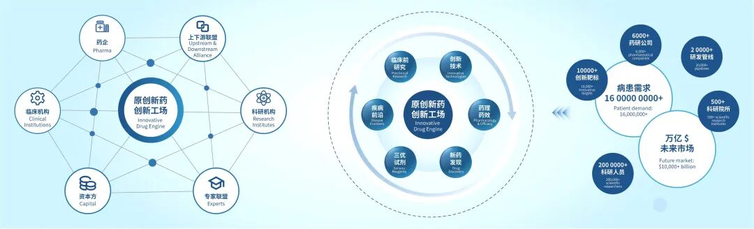 首先,是构建一个相互赋能的“网络生态圈”,联合药企、上下游产业链伙伴、科研机构、临床中心、投资机构等多元主体,促进创新要素的高效整合与价值转化;其次,是打造一个深度开放的研发平台,集成从技术探索到临床前研究的各关键模块,推动模式从“项目服务”向“平台赋能”与“生态共建”演进;最终,赋能全球创新伙伴,连接数以万计的创新靶点、全球药企与亿万患者需求。