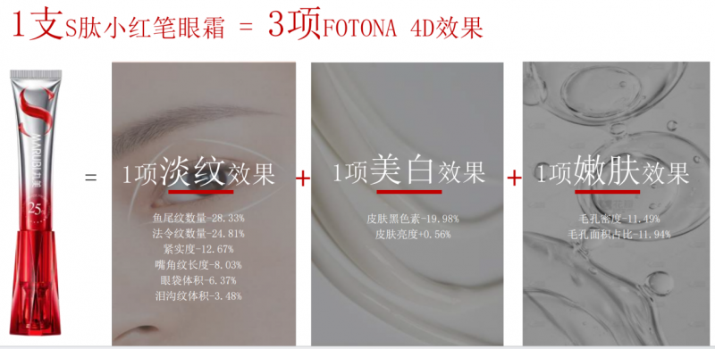 A:其核心功效为“5分钟消肿、1夜焕亮、7天淡纹,由眼及面全脸抗老”。在数据支撑方面,经权威实测,28天10项肌肤维度的改善效果媲美FOTONA 4D医美项目,可淡化全脸11处纹路。其定制的25%高浓胜肽PRO能够直击《Cell》标明的8大衰老标记物。