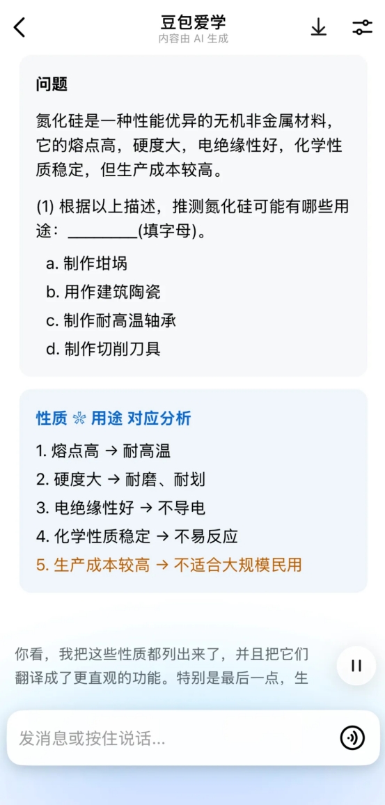 在我的启发下,她又输入给豆包爱学一个问题,“高中生写作文如何避免‘假大空’又能得高分”,很快得到了一份长达上千字的回答,女儿读完后说,“老爹,比你那本辅导人写作文的书回答得好”,我有点儿不服气。在女儿用AI拍摄完一道化学作业,逐步看解题过程,我打算再发表点意见时,她说:“您去书房休息吧,这题估计一行您也看不懂。”这话倒也在理,我的特长毕竟也不是化学。