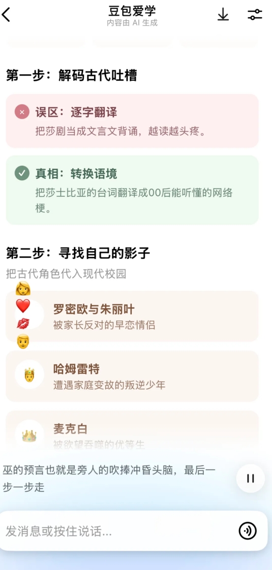 打开对话框,功能选择栏非常之多,豆包爱学在显眼位置,并行功能里还有批改作业选项。女儿的作文写作,在小学时非常灵动,到中学逐渐套路化,对此我一点办法没有,我所能做到的鼓励是,支持她带经典名著去学校看。有出版机构送了我一套5本的《莎士比亚悲剧喜剧全集》,我读了其中一本约三分之一篇幅后,决定送给她读。两周后把她从住宿学校接回家,她说已经把《全集》全部读了一遍,我随机挑了其中一个剧本让她讲梗概,她顺溜地一口气讲了出来,我大喜,随即将《神曲》《推销员之死》等一批书架上我读不下去的书都装进了她的行李箱。这次她询问豆包爱学的问题是“中学生该如何理解莎士比亚的戏剧”,豆包爱学分三步,从第一步“解码古代吐槽”这一带有趣味性的话题谈起,到第二步“寻找自己的影子”结合现代校园生活邀请孩子“对号入座”,第三步“破解剧情套路”讲解莎士比亚悲喜剧的创作过程,在讲解时,豆包爱学一边列提纲,一边语音详解,与课堂模式异曲同工。对于没读过《莎士比亚全集》的人来说,我只能保持沉默。