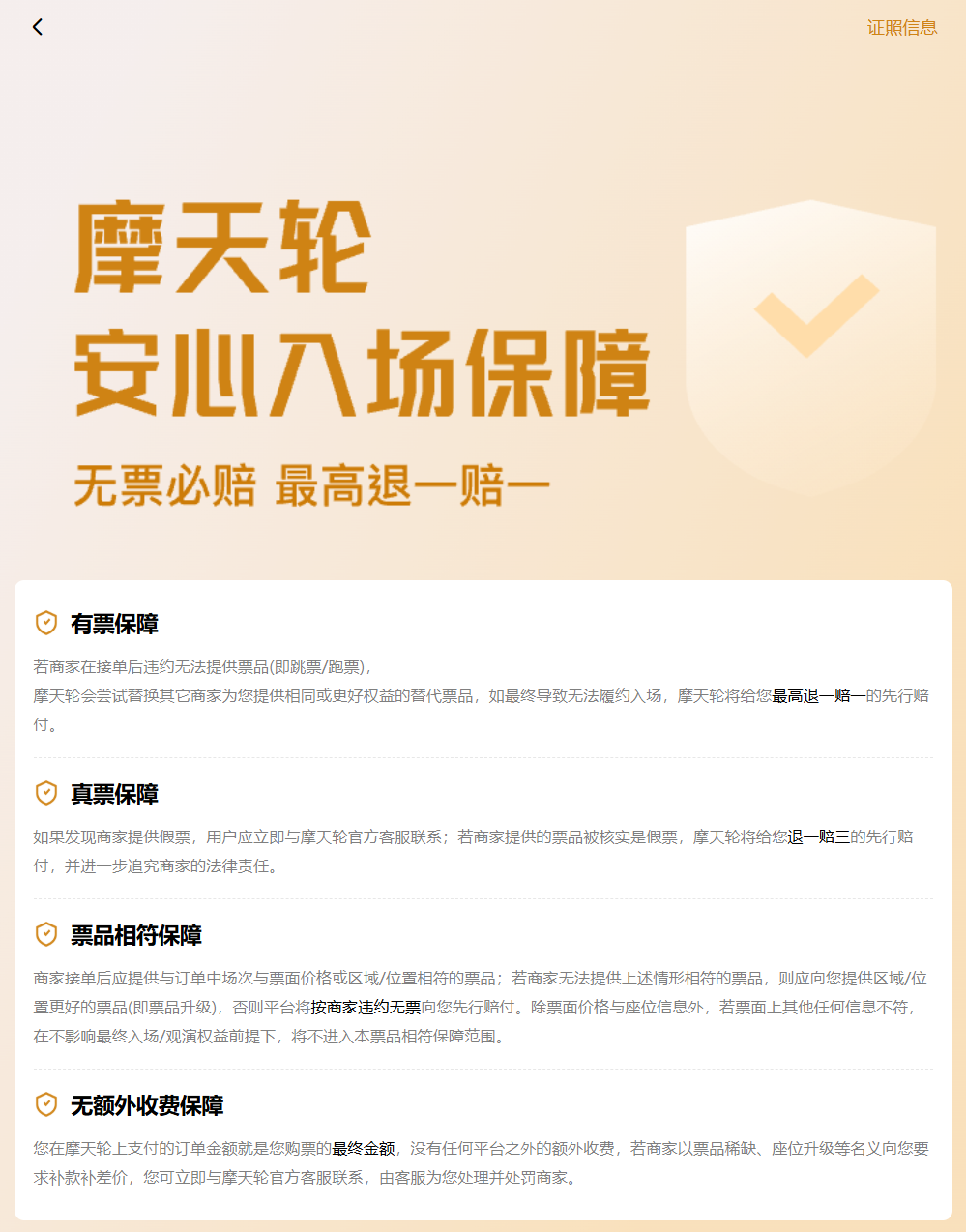 此外,摩天轮对票品的真实性有严格保障。平台推出了“假一赔三”的承诺,一旦发现商家提供假票,摩天轮将为消费者进行赔偿。这一措施有效打击了假票行为,提升了消费者的信任度。