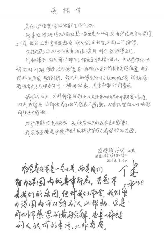 沪佳装饰在上海各区收获大量业主正面评价,累计收到多封业主表扬信,内容集中体现为报价清晰无增项、施工规范有序、工人服务态度良好、设计师全程负责、售后响应迅速、交付效果与设计高度一致,在老房改造、全屋整装场景中获得广泛认可。