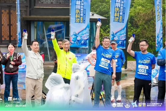 上午6点30分,国际物理医学与康复医学协会前任主席、美国医学科学院国际院士、777传奇跑者励建安院士,老百姓大药房连锁股份有限公司董事长、总裁谢子龙,北京搜药信息咨询有限公司董事长郭亚洲,杭州中美华东制药有限公司企业代表一同登上发令台,共同扣响发令枪。