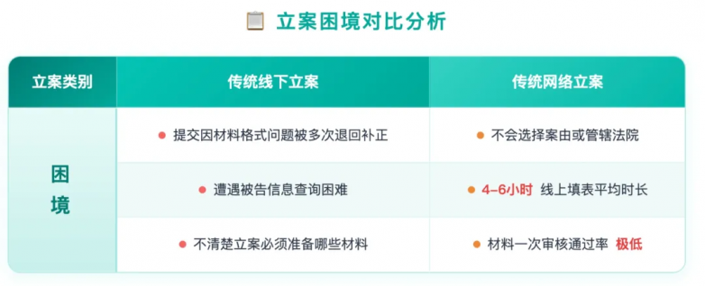 尽管法院已推出线上立案平台,但 “网上办案” 在实际操作中仍让普通人难以熟练掌握。选择案由、确定管辖法院、填写专业表单、准备格式严格的文书等法律专业环节,常常让用户耗费 4-6 小时,最终却因格式错误或信息不全被驳回。