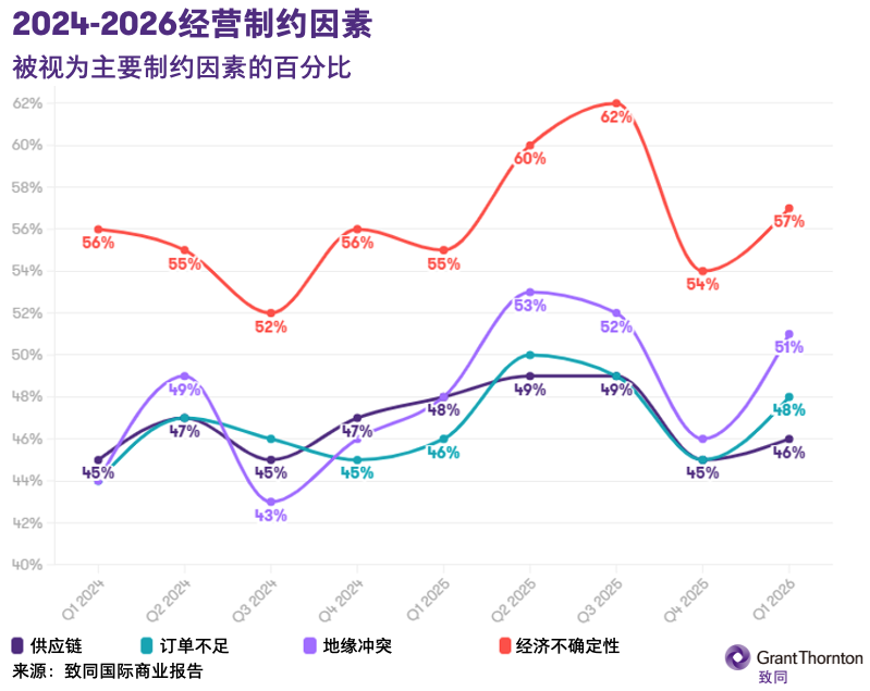 报告显示,企业管理者普遍担忧战争局势对交货周期及物流运输成本带来冲击。预计相关成本将上升的企业占比提升5个百分点至47%。与此同时,担忧需求走弱导致订单不足的企业占比亦上升4个百分点,达到48%。目前,已有51%的企业将地缘政治风险视为主要经营制约因素,较此前增加5个百分点。对经济不确定性的担忧也在蔓延,持此观点的企业占比上升4个百分点至57%。
