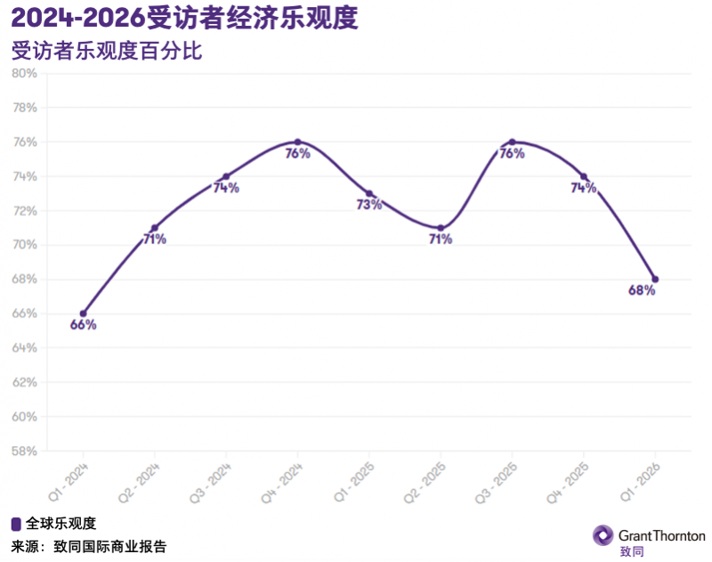 致同国际最新发布的《国际商业报告》显示,受伊朗局势影响,2026年第一季度全球中端市场企业乐观情绪大幅下滑,较上期下降6个百分点至68%。