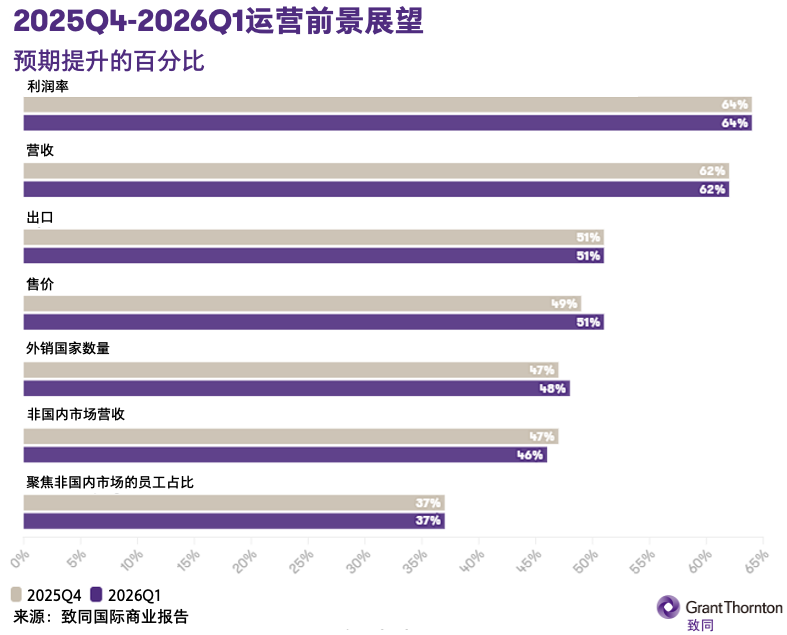 尽管伊朗局势的影响仍将持续,特别是霍尔木兹海峡若长期关闭或通行受限,将对全球供应链形成较大扰动,但不可否认的是,中端市场已经积累了不少应对危机的经验。从俄乌冲突到疫情期间的供应链调整,企业对市场剧烈波动的适应能力显著提升。这在一定程度上解释了尽管外部环境趋紧,企业对盈利前景的预期并未出现大幅波动。仍有64%的企业预计盈利能力将实现增长,与上季度基本持平。