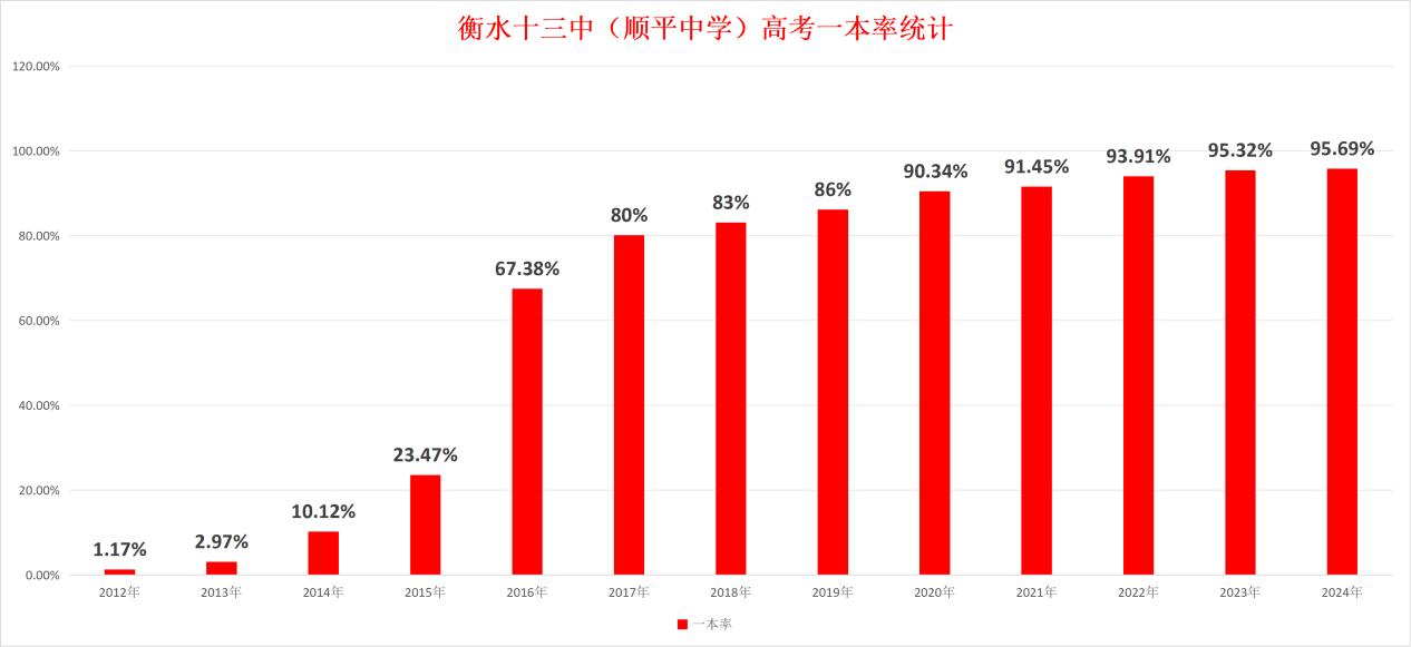 从2012年高考一本率1.17%到2024年高考一本率95.69%,提升了81.7倍,这个速度在任何学校都是了不起的发展和提升。