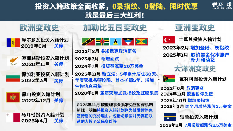 当前,全球投资入籍护照政策全面收紧,海外身份规划黄金窗口期进入倒计时,错失将面临费用上涨、流程繁琐、门槛提高的困境。