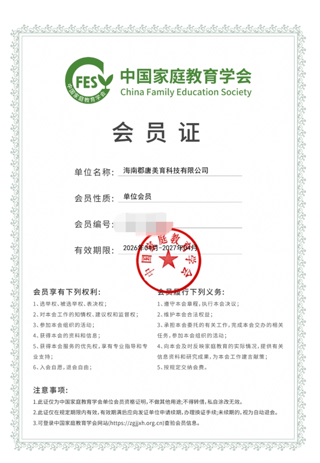 近日,海南郡唐美育科技有限公司(旗下运营品牌“大咖素质训练营”)正式获批成为中国家庭教育学会会员单位。此次入选,体现了国家级学术组织对大咖素质训练营在家庭教育领域专业能力、实践成果与社会价值的综合认可,也为企业进一步参与家庭教育公共服务、助力行业规范发展提供了新的平台。