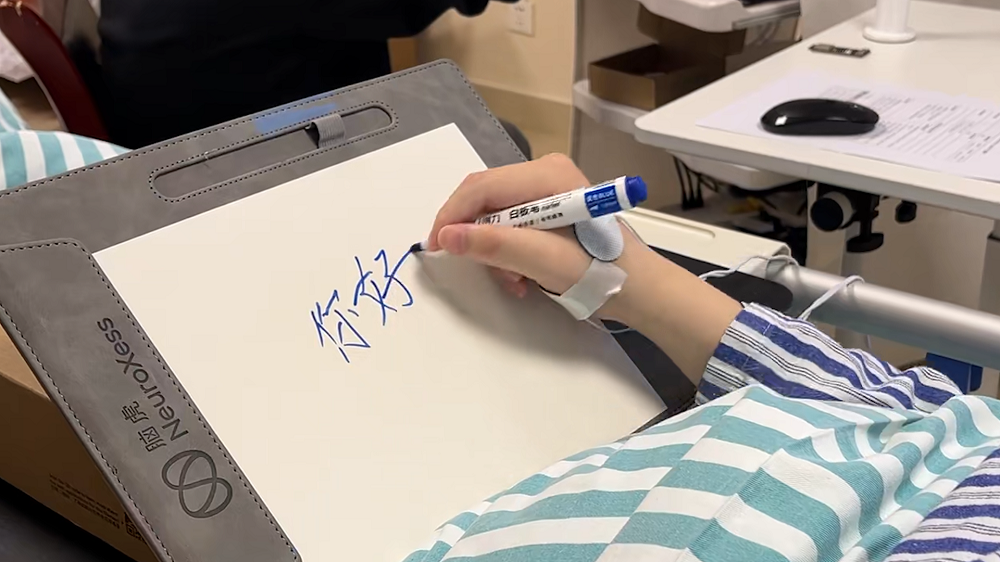 更具突破的是,本次临床首次采用脑机接口驱动的功能性电刺激技术(BCI-FES),将“三全”系统与功能性电刺激(FES)技术深度整合,构建了“意念-解码-刺激-动作”的完整闭环:通过皮层电极精准采集并实时解析运动意图,绕过受损脊髓,精准刺激外周肌肉,实现手指自然协调动作。临床验证显示,患者术后1个月已通过意念控制实现患侧手部精准主动抓握,可自主完成书写、绘画等高精度动作,真正将控制目标回归患者自身肢体。