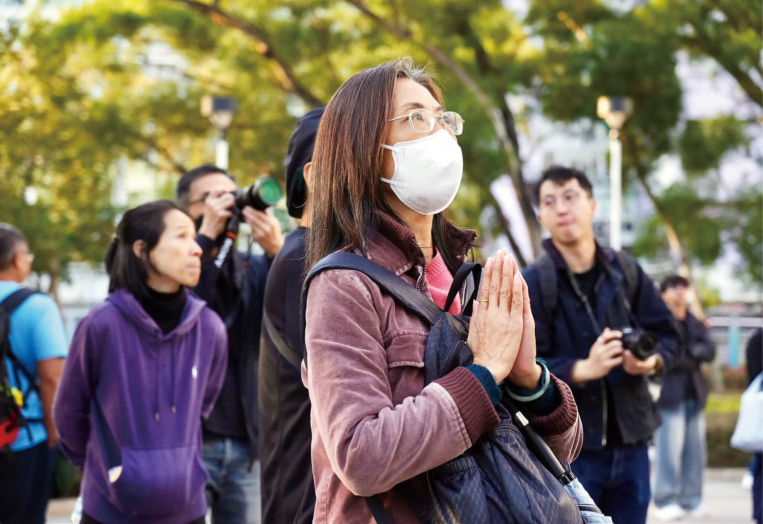 上图:大埔宏福苑火灾熄灭不久后,有市民自发到宏福苑楼下双手合十祈祷。