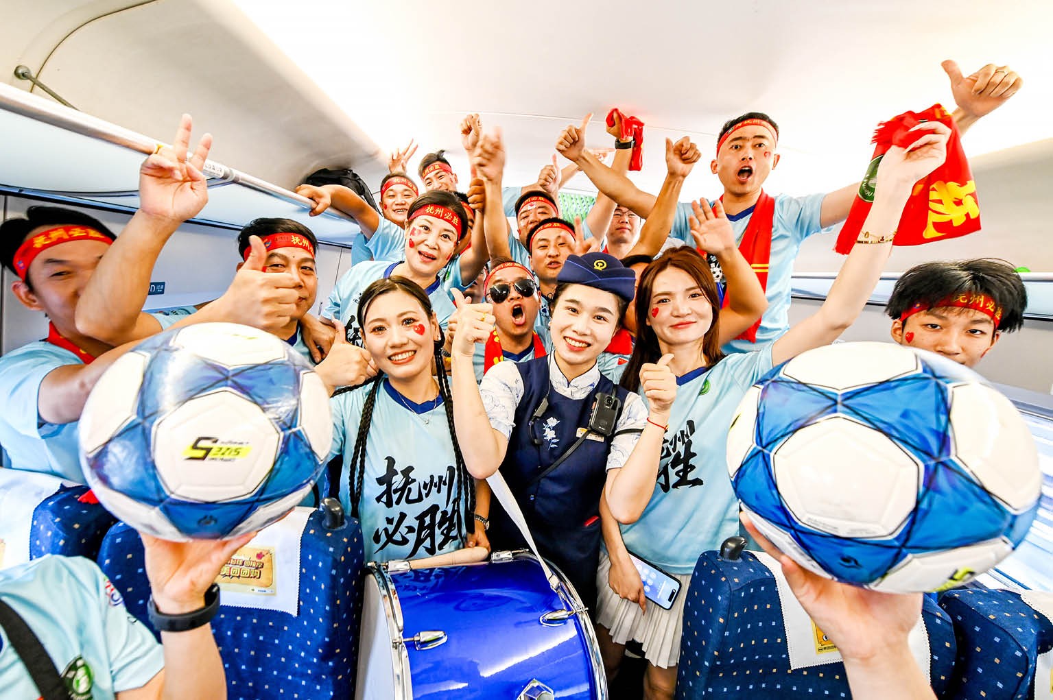 上图:2025年9月7日,在抚州开往吉安西的G9812次“赣超专列”上,工作人员和抚州球迷齐声呐喊助威。当日,这趟列车上载有382名抚州球迷。