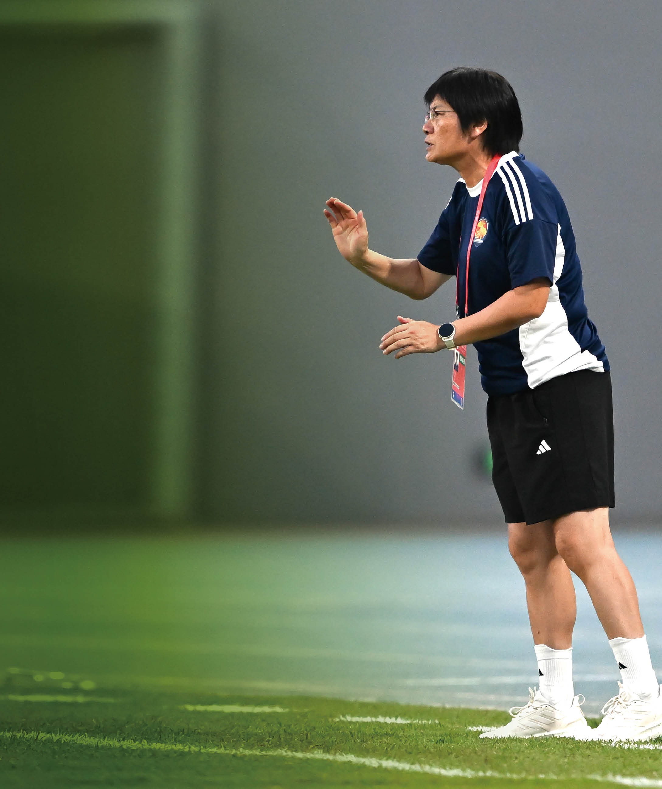 上海女足主教练水庆霞在十五运会的比赛中指挥。
