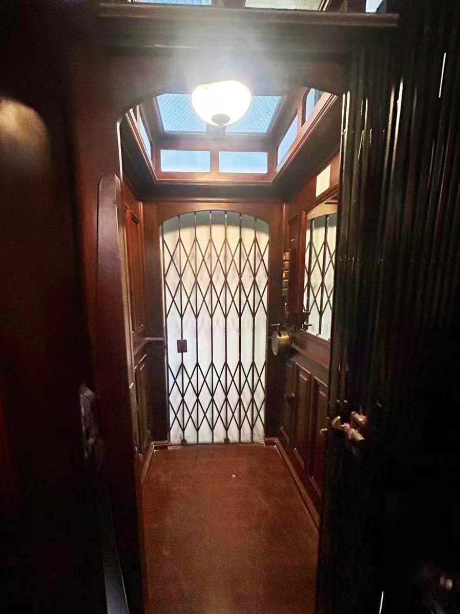 上图:大楼幸运地保存着一部百年前的英国SMS公司的铁栅栏电梯,且修缮好可以使用。