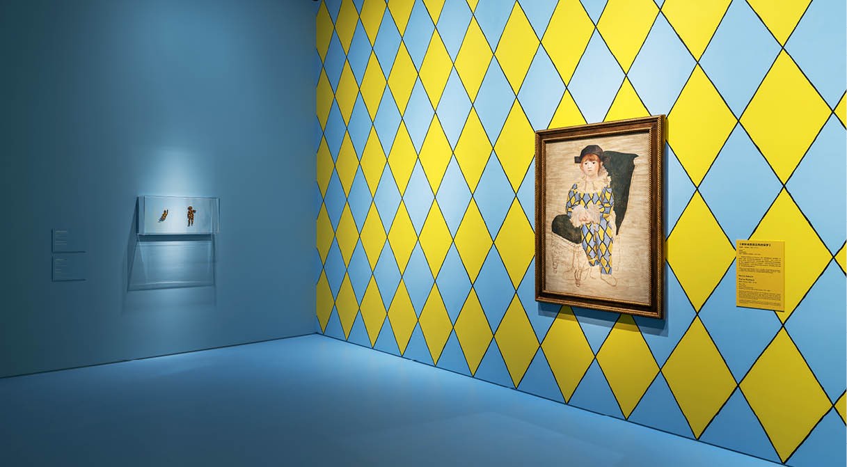 在“童年”展厅,作品本身成为展陈设计的一部分,保罗·史密斯形容,这里是一处“儿童房”。《与玩具卡车玩耍的孩子》面前,展墙铺开大片的深绿,与画中的绿色彼此对话。《装扮成喜剧丑角的保罗》则置身于蓝黄交错的菱形背景之中。这些作品呈现了毕加索创作中柔和而富于象征的一面。毕加索一直将童年视为其创作中的核心,儿童在他的创作中既是描绘对象,也是引发形式革新的重要源泉。他借由儿童视角的天真与自由,从中提取新的线条与形体方式,寻求摆脱传统绘画规范的可能,“像孩子一样画画”成为贯穿他艺术生涯的内在愿望。