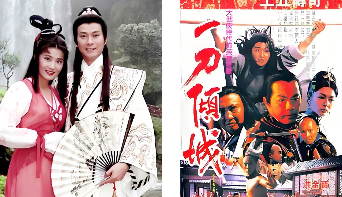 右图:杨丽菁与狄龙、赵长军等主杨丽菁与郑少秋。演《一刀倾城》。
