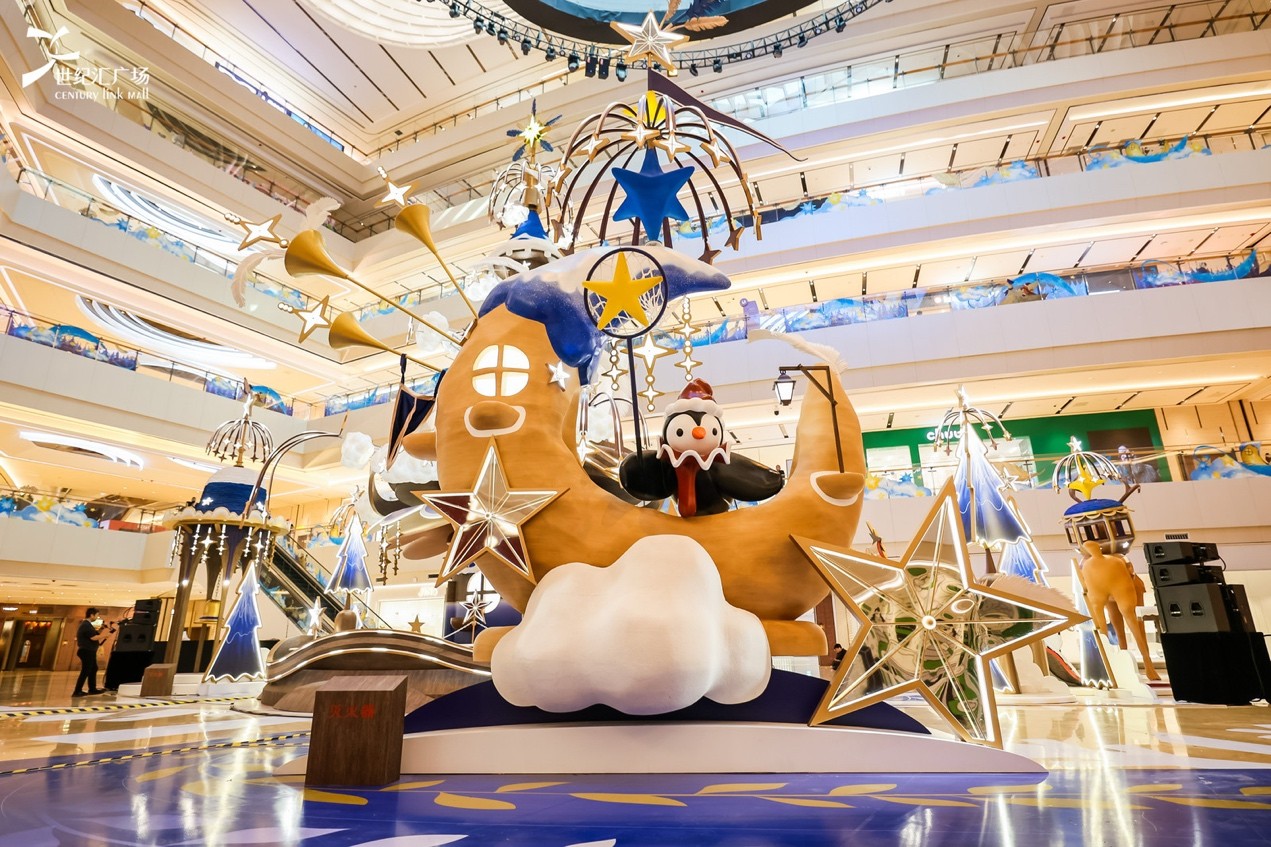 漫步在上海世纪汇广场内,秘蓝、鎏金、月光银与蓬松白的主色调宛如一本被冬雪浸湿的古老童话集,每一处细节都流淌着温柔诗意。从办公楼T2户外广场的云端钟塔启程,圣诞钟声里,鎏金飞羽轻柔飘落,宛如梦境的邀请,循着羽毛指引走过地铁8号口的星河廊桥,绒布云朵与光影地贴交织成通往奇幻世界的入口,直穿过廊桥便抵达LG2中庭的月亮湖——圣诞梦境的终极舞台。圣诞信使将自己的圣羽化作湖中的圣诞树,构成了这座巨大而精巧的装置。猫头鹰整点定时旋转,烤漆外观瑰丽无暇,动物造型栩栩如生,繁复灯光引人流连,访客们乘羽毛小船造访这汪占地近500平方米的绮丽心湖,拾取水面倒映的美丽愿望。在办公楼区域的秘境深处,金属发光星星与可爱动物搭建起圣羽舞台,静候神秘表演嘉宾压轴登场,为这场冬日童话画下璀璨句点。